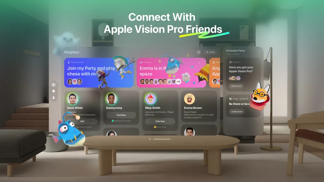 In inSpaze, meet other owners of Apple Vision Pro, functions like spatial audio, persona, and real-time voice translation offer an unparalleled sense of presence for user, it feels just like you are talking to someone right in front of you. You can play board games, share spatial photos and videos, or even your 3D models with others at the “Party”. iPhone version is also available to keep Apple Vision Pro friends connected anytime, anywhere.