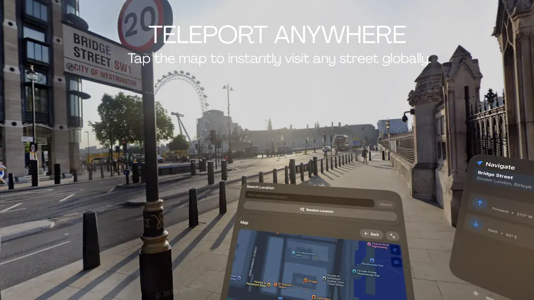 Step inside real-world cities with immersive 360° Street View. Tap anywhere in the world map, discover streets, landmarks, and explore the cities like never before. Teleport instantly to the streets of Paris, the neon lights of Tokyo, or the quiet roads of your childhood home. all designed exclusively for Apple Vision Pro. IMMERSIVE EXPLORATION • World Map with Full 360° panoramic Street View environments • Seamless movement between connected streets SMART NAVIGATION • Interactive world map with live position tracking • Search any address, city, or landmark globally • Tap-to-teleport anywhere on the map • Navigation history for quick backtracking • Random location discovery for spontaneous travel PERFECT FOR • Virtual travel and world exploration • Trip planning and location scouting • Geography and education • Architecture and urban discovery • Revisiting meaningful places • Discovering new destinations from home Upcoming Features: - SharePlay integration, waddle with your friends! - Guided tours - Wikipedia integration for learning - Trips, let Waddle take you around the world - Create your own trips - And much more ! Note: This app uses data from Google StreetView but is not an official Google product.