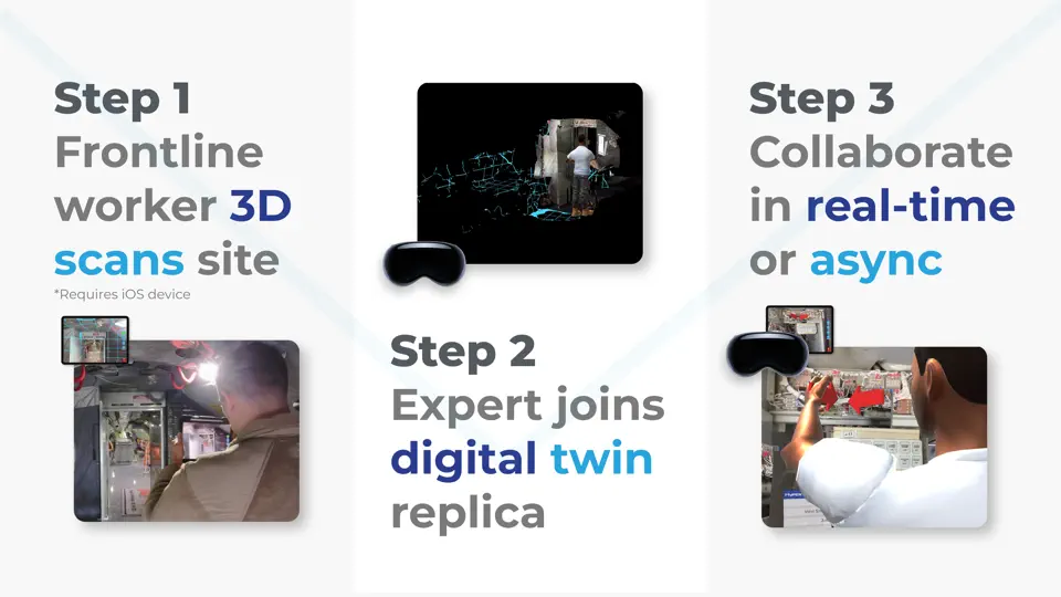 HyperTunnel's mixed reality platform connects frontline workers with remote experts across space and time, eliminating travel costs and solving problems faster. Frontline workers can scan the worksite to create an immersive digital twin, allowing the remote expert to spatially collaborate in real-time (or asynchronously) as if they were side-by-side. Using just a mobile device, frontline workers can quickly scan a worksite to create a 3D digital twin. The expert immerses in the digital twin using VR, allowing them to see and interact with the environment as if they were right there on site. The worksite and the digital twin are synchronized, and digital annotations - such as photos, videos, arrows, etc. - created in one place will appear in the other place in the exact same location. The expert and the frontline worker can collaborate in real-time using HyperCall. Or asynchronously, using HyperNote, where they can record and play back detailed 3D messages.