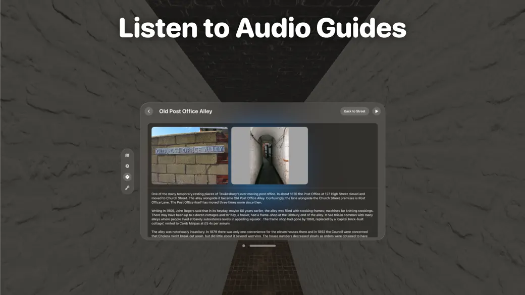 Explore the historic alleys and courts of Tewkesbury using the Project Alleycat app. The app contains the most detailed mapping effort of the alleys in Tewkesbury. Choose to get notifications when you are nearby an alley to go exploring. Discover the alleys by taking the three tours, which contain short spoken highlights of the alleys and courts. Read about the extensive history of each individual alley with detailed written guides about each one with additional photographs. Use the app to learn more about Project Alleycat and other ways to get involved. We encourage schools and community groups to use the app to promote knowledge of Tewkesbury and general education.