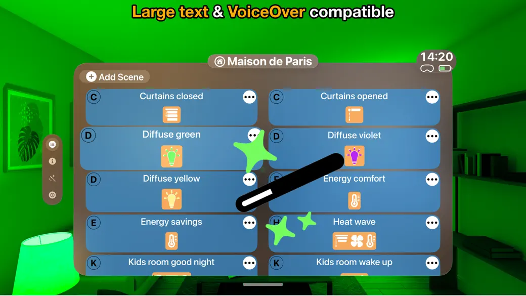 Swipe, click your Smart Home is setup! Customize with Shortcuts. Managing your Smart Home has never been easier, no matter how many devices you have. ● Powerful HomeKit Scenes Set your favorite configurations for one or multiple devices with just a single tap. Whether it’s dimming the lights, opening or closing the curtains, adjusting the thermostat, launching scenes has never been this smooth. ● Supercharged scene launching : fast, easy, and intuitive. Choose your way: - Swipe in the app to the desired scene in the list and click on it. - Swipe your Home Screen, search your chosen scene with Spotlight to launch it*. - Launch your scene from your shortcuts* : by the Shortcuts app, Siri, Control Center, Action Button or on your iPad with Apple Pencil Pro. ● Optimized Ergonomics Scenes show your main accessory, the chosen color for your light, your preset position for the windows shutters. ● Personalized AI Suggestions Your favorite shortcuts suggested at the right time in Spotlight search, based on your habits. ● Enhanced Accessibility All these features are compatible with large fonts, Dark Mode and VoiceOver for an inclusive experience. ● Comprehensive Sensors Overview You also get an overview of all your sensors, including thermostats, air quality, temperature, humidity, the status of blinds, doors, and connected Velux windows, as well as their battery levels. ● CO2 automations Automate CO2 sensor monitoring to open your Velux or connected windows when CO2 levels are too high. If you don’t have automated windows, turn on a light as a reminder to ventilate. You’ll enjoy healthier air. ● Save energy** Set your HomeKit or Matter compatible devices to energy-saving mode when you’re away and switch them back to comfort mode upon your return. Save on heating and cooling with compatible smart thermostats. No more worrying about leaving the lights on. Whether you’re off to work, running errands, or working from home, energy-saving or comfort settings adjust automatically using presence detection on your personal Apple device, even on the family-configured Apple Watch for the youngest member. Looking for new automations? Subscribe today to enjoy them as soon as they’re released while keeping our current favorable subscription rate. You’ll save energy and enjoy enhanced comfort. Simplify your smart living today. Download Maisomage now and enjoy your license immediately across all your platforms : iPhone, iPad, Apple TV, Mac & Apple Vision Pro. *A subscription is required. Enjoy unlimited shortcut usage for 2 days every 7 days period. In between, 2 shortcuts remain usable per day before subscribing. ** A subscription is required. License Agreement: https://www.apple.com/legal/internet-services/itunes/dev/stdeula/ Privacy Policy: https://lapplienrose.paris/mentions_legales.html Maisomage defines automations managed by your HomePod, HomePod mini, or Apple TV (4K or HD) and default location services activated for Apple HomeKit in your iPhone’s system services.