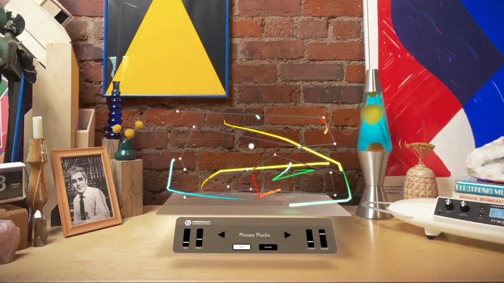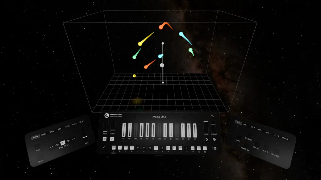 Animoog Galaxy is a multidimensional sonic, visual and spatial experience, designed by Moog Music specifically for Apple Vision Pro. Powered by Moog’s Anisotropic Synth Engine (ASE), Animoog Galaxy lives alongside you in your physical space, infusing it with constantly evolving sounds and colors. Dial it in exactly the way you want or let Animoog Galaxy surprise you to keep your mind active and engaged. With over 120 professionally designed presets, a change of atmosphere is always just a finger tap away. When you're ready, teleport inside Animoog Galaxy and play its innovative synthesizer with an expressive keyboard that was created for Vision Pro's gestures. The slightest nuance of your playing can change the sound, while Animoog's intelligent correction algorithms ensure that you'll always play in tune, unless you disable it to explore the spaces between the notes. The new step sequencer with probability and smart randomization can instantly help your inspiration with melodic and rhythmical lines, and the audio recorder loops and layers any sound you hear, organically building up to a full performance that can be shared with others. Animoog Galaxy embodies the immediate and intuitive experience of Moog synthesizers and applies it to spatial computing, enabling you to quickly sculpt incredibly fluid sounds that live, breathe, and evolve in all dimensions. By expanding the side panels, you gain access to all of the synthesizer's controls, conveniently offering full sound design capabilities when you want to dive deep. Animoog Galaxy can be many things: a lifestyle companion that helps you find inner peace, an innovative spatial musical instrument that pushes the boundaries of your creativity, a professional synthesizer with a sonically rich universe, or anything in between. Key Features: • Anisotropic Synth Engine (ASE): Animoog Galaxy utilizes an exciting Moog technology that allows you to spatially move through the X, Y, and Z axes of unique timbres to create an expressive and constantly evolving soundscape. • Immersive Experience: Constantly evolving sounds and visuals help create a peaceful mood and environment all around you. Fully immerse yourself in Animoog Galaxy's universe with a futuristic user interface that takes cues from popular sci-fi imagery. • Designed for Apple Vision Pro: Visuals, graphics, gestures, interactions and sounds were created specifically for Apple Vision Pro, embracing and amplifying its unique capabilities. • Modulation and Pitch Shifting: Control Animoog Galaxy's advanced gestural keyboard with configurable scales, pitch correction, and glide. Simply look, pinch, and drag to control multiple per-voice parameters. • Intelligent Step Sequencer: Rhythmical melodies can be generated in-tune with the keyboard. • EG/LFO: Articulate your dynamics with three independent six-stage DAHDSR envelope generators for Amp, Filter, and Mod, each with loop and sync functionality. Give motion to your sound with three independent LFOs featuring continuously variable wave shapes, phase offset, delayed start, sync, and support for 1-8 repeats. • Mod Options: Animoog Galaxy features a highly flexible modulation matrix with 10 lanes and a multitude of sources, controllers, and destinations—including global destinations like Delay and Thick. • Expansive Effects: Experiment with a collection of dynamic sound-altering and sound-augmenting effects with Delay, Unison, Bitcrush, Drive, Filter, Arpeggiator, and Recorder. • MIDI Integration: Use your favorite MIDI controller to control Animoog Galaxy (with full support for MPE input) or go MIDI out to use Animoog Galaxy's highly expressive keyboard to control your favorite instruments. • Additional Features: Animoog Galaxy includes backwards compatibility with presets and timbres from Animoog Z, Spatial Audio, 440Hz base frequency offset (+/- 10Hz), and preset tagging.