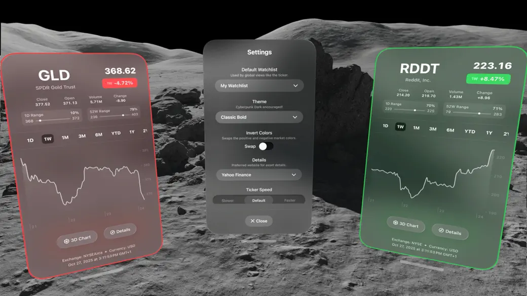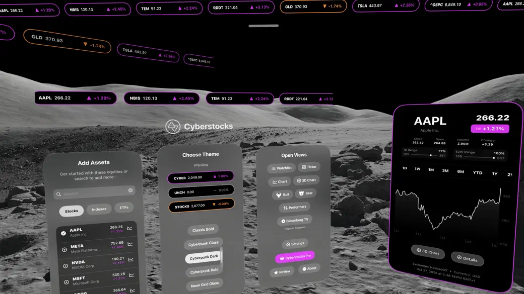 迈入金融的未来。Cyberstocks 将实时市场带入你的空间,数据在你周围漂浮,图表以 3D 形式生动呈现,主题闪耀着赛博朋克风格。无需注册,不收集任何数据。