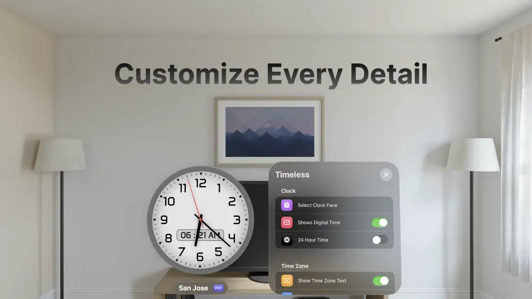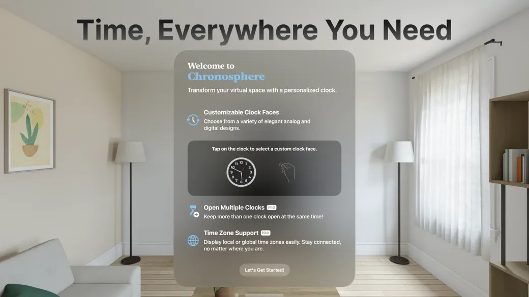 Chronosphere: Time Redefined Chronosphere offers a unique way to display time in your virtual space. With an emphasis on simplicity and elegance, our app allows you to experience time like never before. Features: - Analog Clocks: Display the time with beautifully designed analog clocks, bringing a classic touch to your virtual environment. - Digital Text Display: Enhance readability with an optional digital time overlay, combining the traditional with the modern. - Diverse Styles: Choose from a variety of clock designs to fit your style and preference, ensuring your virtual space is uniquely yours. - Multiple Clocks (Pro Feature): Open multiple clocks simultaneously, perfect for multitasking or decorating your digital space. - Timezone Support (Pro Feature): Stay connected globally with timezone support, allowing you to track different time zones effortlessly.