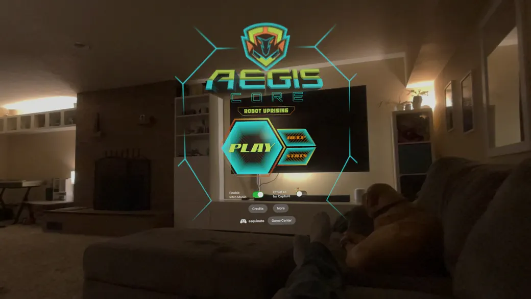 Aegis Core - Robot Uprising is an immersive augmented reality shooter exclusively designed for Apple Vision Pro, where your space becomes a battlefield against a robotic uprising. As humanity's last line of defense, you'll don a virtual combat helmet with an advanced HUD system and wield an arsenal of powerful energy weapons. -- The game features four distinct blaster types, each with unique capabilities. Master the art of switching between weapons to tackle different combat scenarios as waves of increasingly challenging robots attempt to breach your position. Strategic power-ups materialize in your space, offering game-changing abilities like rapid-fire mode, spread shots, temporary invincibility, and health restoration. The innovative hand-tracking system allows you to interact naturally with your environment - grab power-ups, switch weapons, and aim with intuitive precision. Your combat helmet's HUD displays critical information including score, health status, weapon heat management, and power-up duration. The game features a wave-based progression system, where each brings new challenges and more aggressive robot behaviors. Track your performance through various metrics including survival time, robot kills, shot accuracy, and overall score. Compete globally through Game Center leaderboards across multiple categories, including lifetime achievements. The game saves your stats and progression, allowing you to unlock advanced weapons in the future as you prove your combat prowess. -- Aegis Core combines arcade-style action with cutting-edge spatial computing technology, delivering an unparalleled mixed reality combat experience where your physical space becomes the arena for humanity's survival.