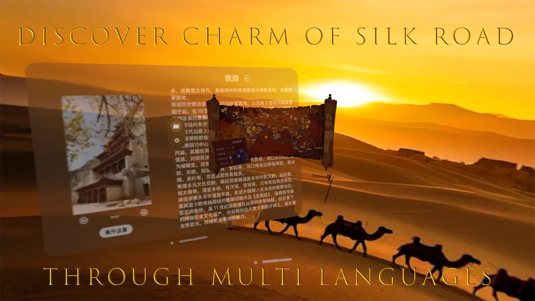 Silk Road Journey offers you a multilingual cultural feast! This app takes you on a deep exploration of the splendid history of the Silk Road, from the bustling alleys of Chang'An, to the mysterious towns of Arabia, and to the water lanes of Venice, through the advanced abilities of Apple Vision Pro, just like visiting in person. Each city is like an ancient poem, narrating the vicissitudes and glories of the past and present. now blink, into sands of glory with Silk Road Journey. A millennium, just one reach away.