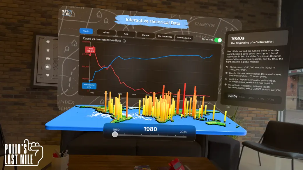 Polio's Last Mile invites you on an emotional journey to Zambia to feel the heartbeat of hope, resilience, and unwavering determination of the heroes on the front lines to end polio once and for all. Through a combination of immersive video, interviews, archival footage, 3D artifacts, and data visualization, you'll be inspired by the people, places, and innovations that have driven the 99.9% decrease in polio. But the threat remains. And it’s a pivotal time in human history. - Revisit the haunting history of polio over the past 100 years, from peak outbreaks in the 1920s to the invention of the vaccine in 1955. - Understand the spectacular impact driven by the GPEI (Global Polio Eradication Initiative) and worldwide collective action. - Transport to the front lines and on the ground in a modern-day, large-scale, door-to-door immunization campaign in Zambia - a critical global strategy in pushing polio into its final chapter. Join us. Take action.