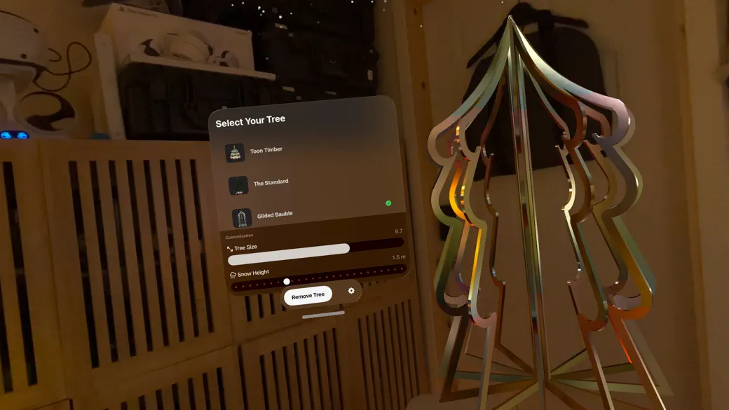 Transform your living space into a winter wonderland with Spatial Tree, the ultimate holiday decorating experience for Apple Vision Pro. Why settle for just one tree when you can decorate your reality with an entire collection? Spatial Tree brings the warmth, joy, and magic of the holiday season directly into your home—without the pine needles, tangled wires, or heavy lifting. DECORATE YOUR REALITY Place a stunning, life-sized Christmas tree anywhere in your room. Whether you live in a cozy apartment or a spacious house, Spatial Tree adapts to your environment. Simply look for the "Golden Grids" on your floor, tap to plant your tree, and watch the holiday spirit take root instantly. A TREE FOR EVERY STYLE Explore a curated library of 12 unique trees, ranging from traditional favorites to avant-garde art pieces. Find the perfect match for your mood: The Standard: A classic, lush green pine for the traditionalist. Toon Timber: A playful, stylized tree perfect for a fun vibe. Chrome Verde & Bullion Stack: Modern, metallic masterpieces for a luxurious look. Nordic Blanc: A sleek, minimal white tree for the modern home. The Origami & Corrugated Craft: Artistic paper-style trees that celebrate creativity. ...and many more, including Gift Wrap Grove, Dashboard Scent, and Ginger-Snap! SET THE ATMOSPHERE Decorating is about more than just the tree—it’s about the feeling. With a single tap, you can toggle gentle Falling Snow to turn your room into a snow globe, all while staying warm inside. Turn on the optional Holiday Music (featuring festive bells) to complete the immersive experience. INTUITIVE SPATIAL CONTROLS Your hands are the ultimate decorating tools. Plant: Tap the floor to place your tree instantly. Move: Pinch and drag to reposition your tree perfectly in the corner or center of the room. Resize: Want a cute tabletop decoration? Or a majestic 10-foot floor-to-ceiling centerpiece? Use the intuitive slider or zoom gestures to scale your tree to the perfect size.